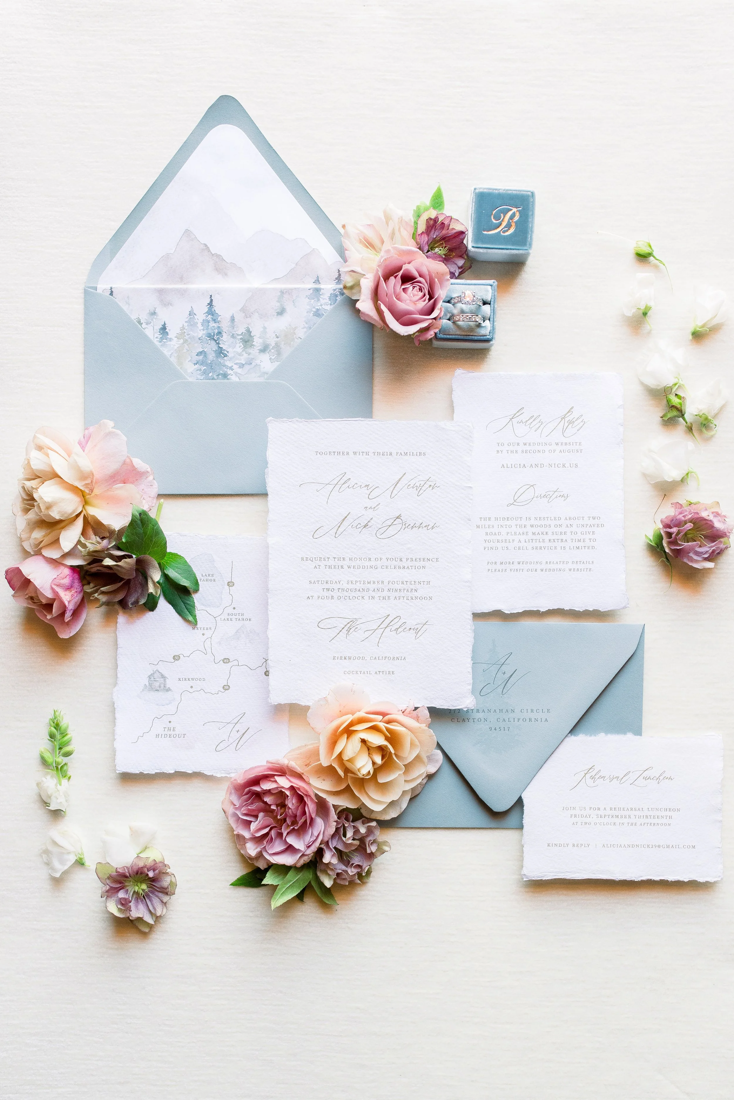 Shown here in a letter press invitation, details and response card with an addressed envelope in a digital white print. Envelope liner, border, script and color-palette customized to you.